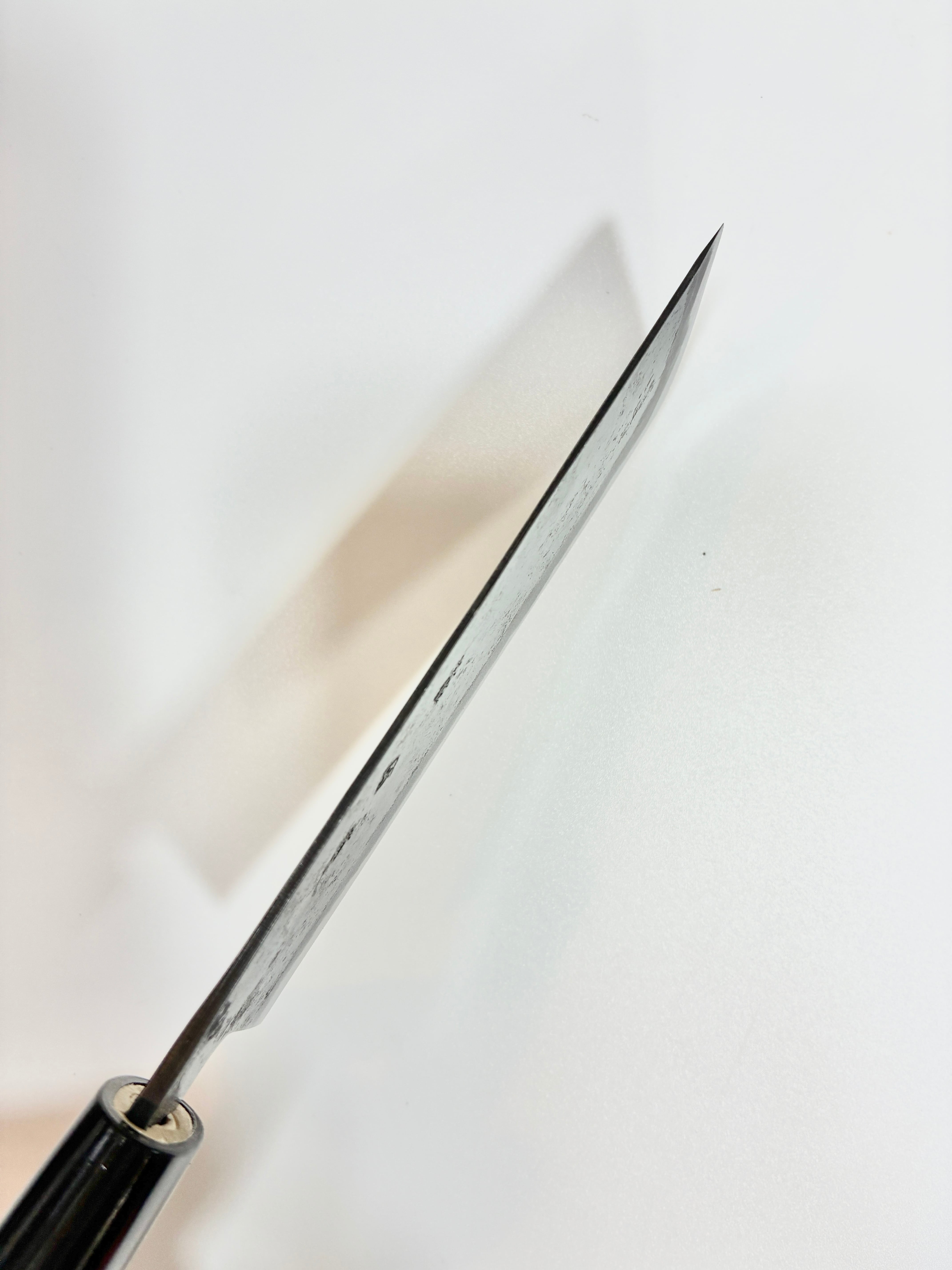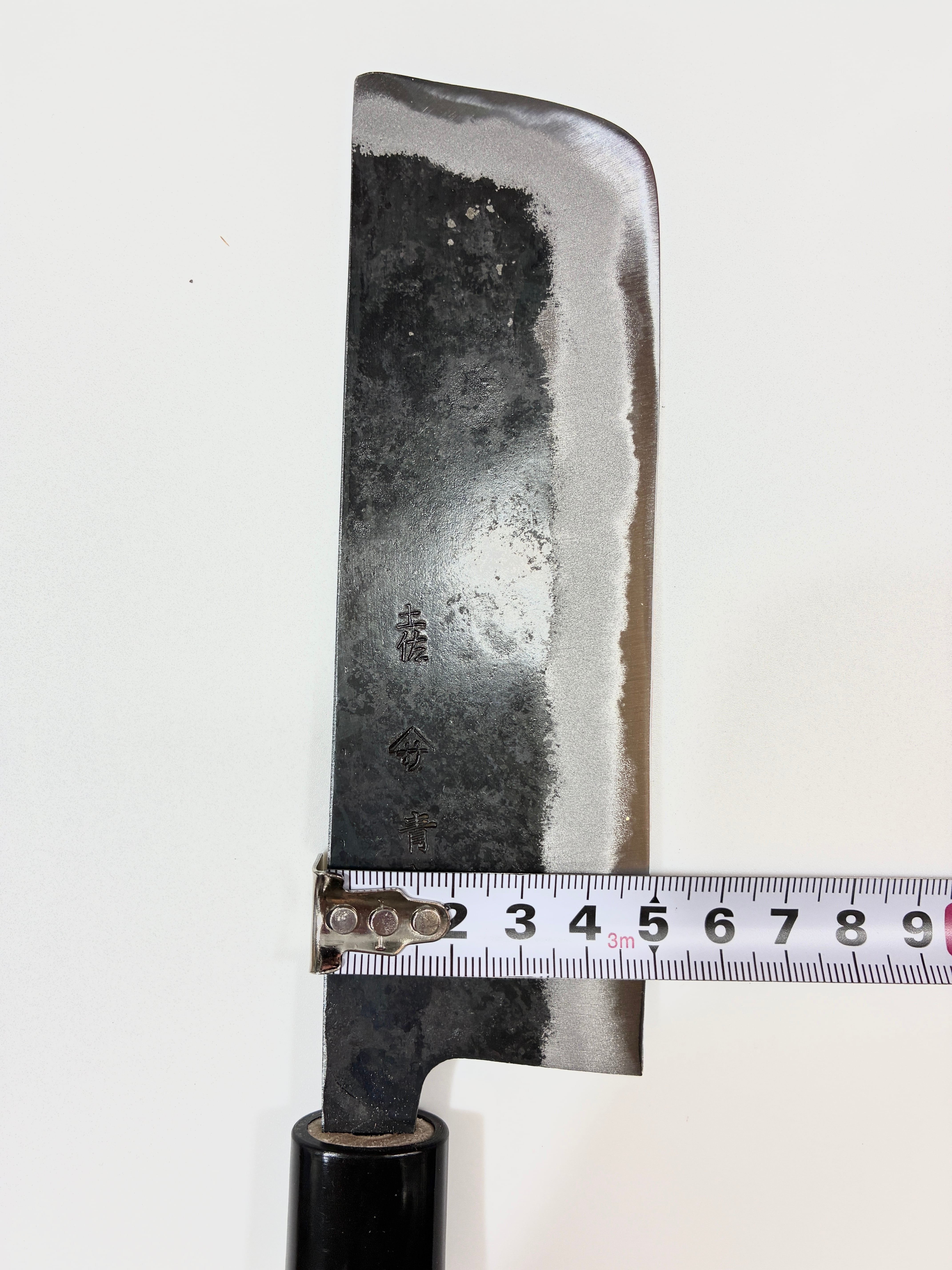 畑で野菜の収穫時に使用される包丁なので、どうしても泥を一緒に切ってしまいます。泥を切ると刃のつぶれが早いので、野菜の収穫包丁は、鋼に安来の青紙鋼を用いて鍛造しています。青紙鋼は硬度がある為、刃持ちが良く永く切れます。農作業の作業効率アップに繋がればと思っています。ブロッコリー・キャベツ・白菜などの元切用。